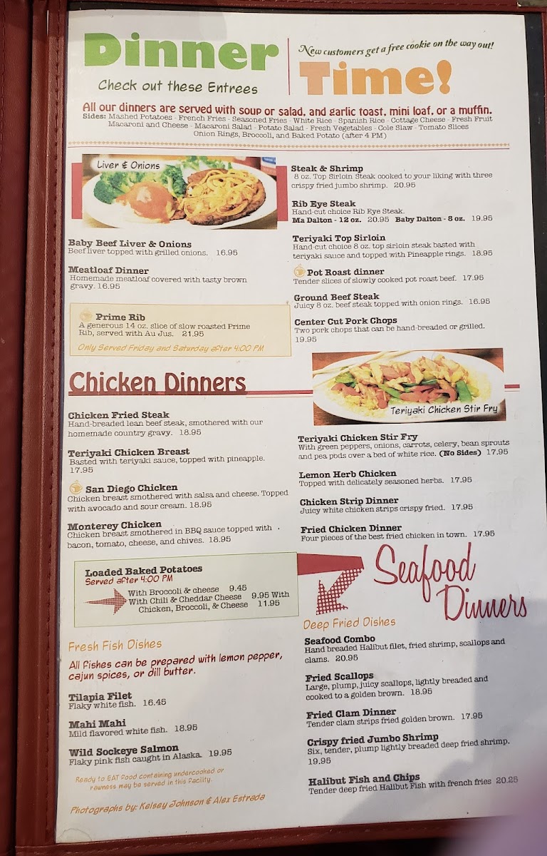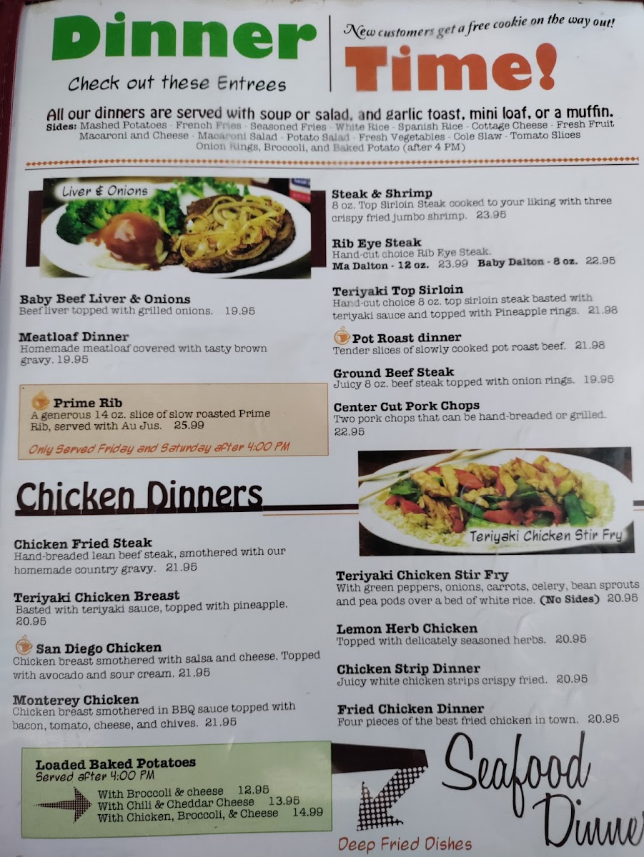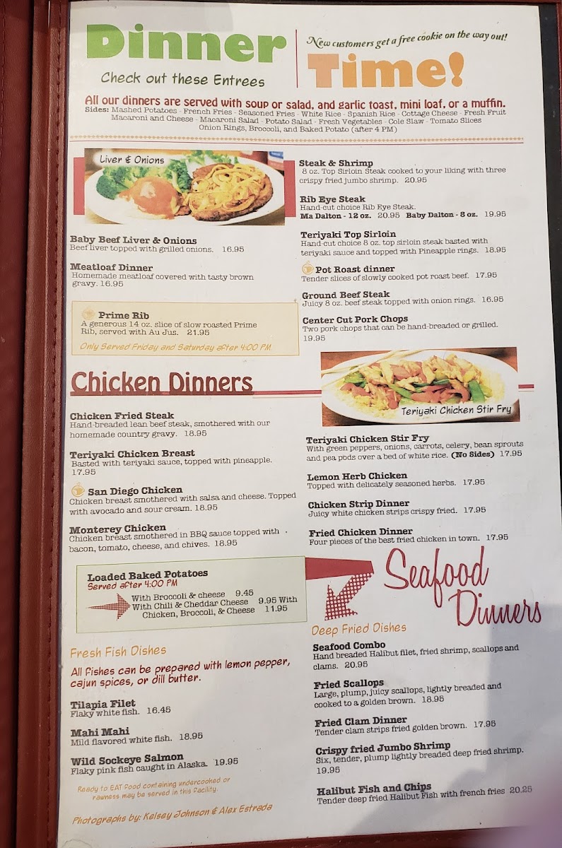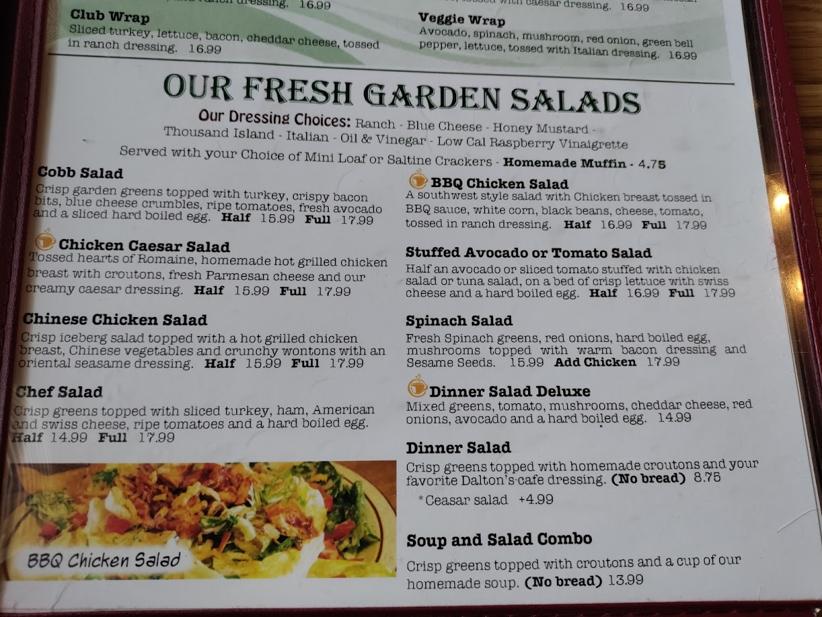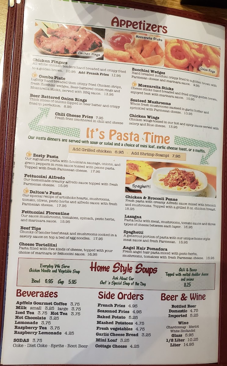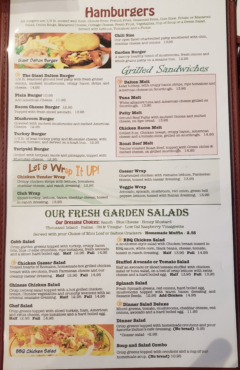 The menu features a variety of all-day breakfast favorites like the Skillet Scramble with Louisiana Sausage, Chili Colorado Omelette, and the Dalton’s Omelette, all served alongside comforting sides such as biscuits, muffins, or pancakes. For those looking beyond breakfast, there are options like roast beef or chicken salad sandwiches, as well as satisfying dinner plates including New York Steak & Eggs or meatloaf made from family recipes.
